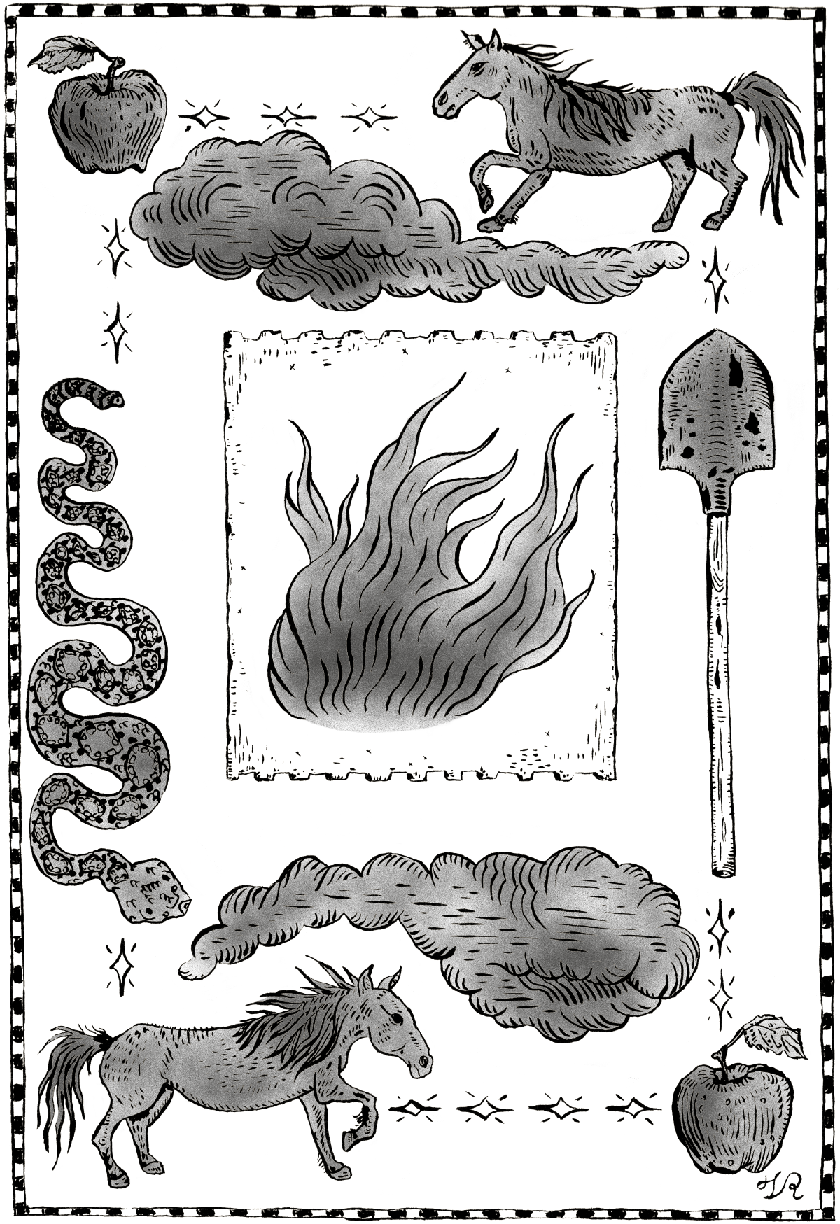 The day I return from Montana with no responsibilities, doing acid to honky tonk, I come home to bear shit underneath the apple tree, elk near the creek, and a rattlesnake whispering threats at my dog, then me, with her tongue, with her tail I grab my pistol but its home is metal I cannot afford a spark. So I carry a shovel, to skin head from body. But when I come back, she has vanished.